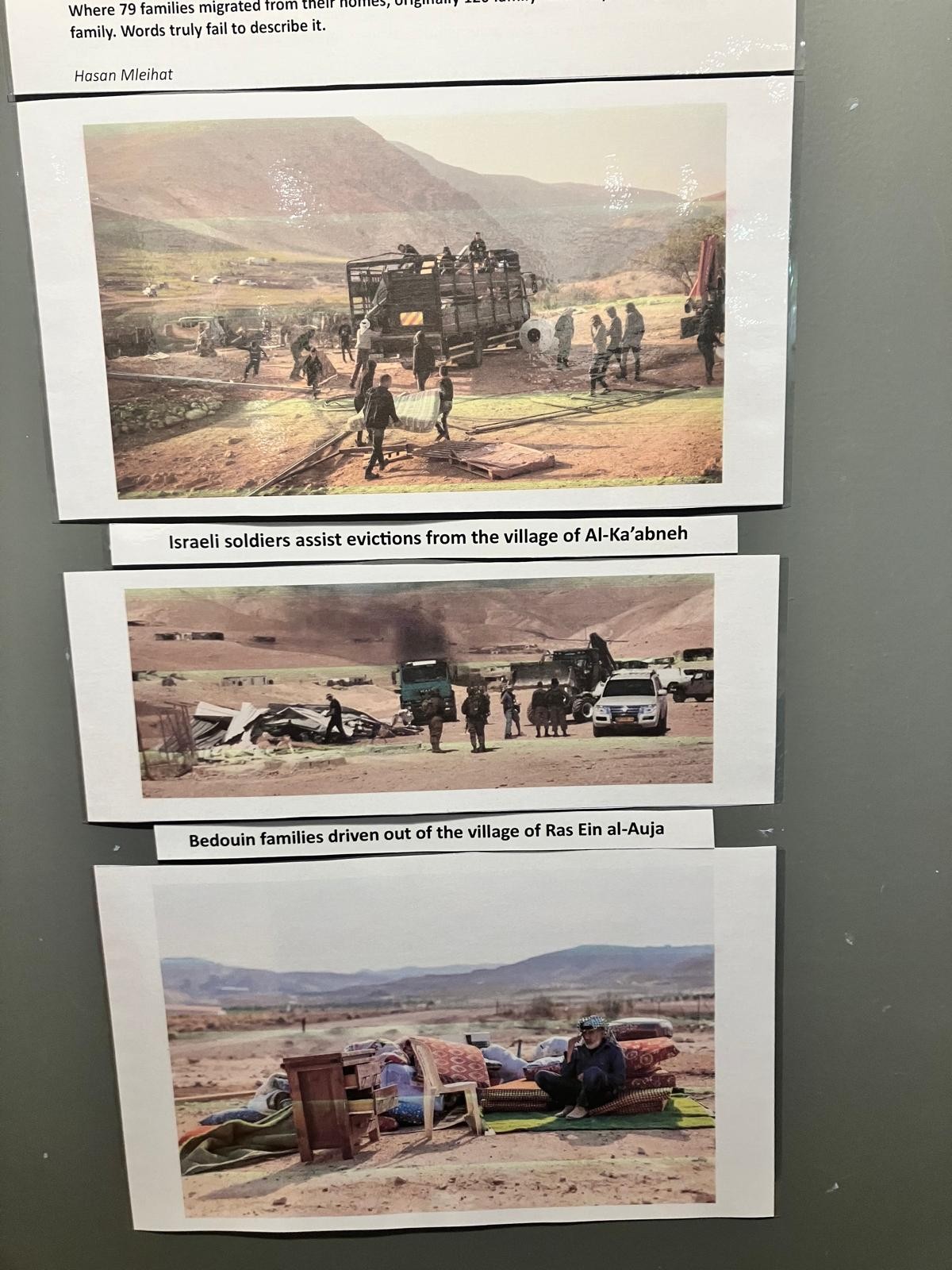 وضم المعرض أعمالًا فنية تحاكي الواقع الفلسطيني، من خلال عرض صور فوتوغرافية ووثائق مصوّرة لتهجير البدو من أراضيهم وممارسات المصادرة القسرية، بما يعكس حجم المعاناة الإنسانية والاجتماعية التي يعيشها البدو الفلسطينين .