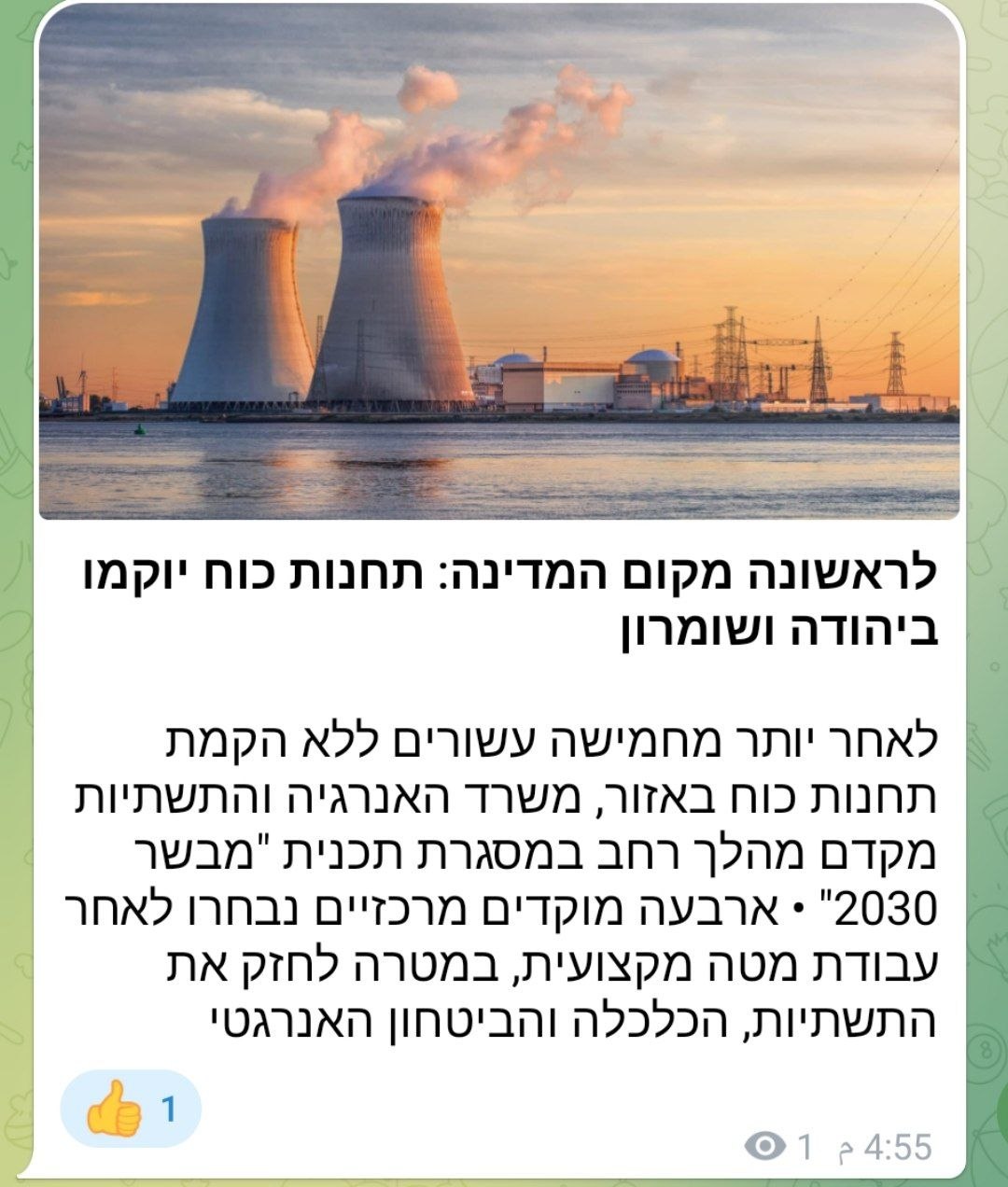 و بشأن محطات في يهودا والسامرةنشرت هيئة الكهرباء الإسرائيلية مبادئ تشغيل لمحطات توليد تعمل بالغاز الطبيعي يمكن بناؤها في يهودا والسامرة بقدرات تصل إلى 800 ميغاواط وربطها بالشبكة الإسرائيلية، ما يؤكد وجود توجه رسمي لتطوير إنتاج الكهرباء في المنطقة