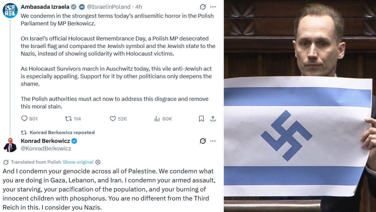 أثارت تصريحات النائب البولندي كونراد بيركوفيتش موجة غضب رسمية، بعد نشره صورة لعلم الاحتلال الإسرائيلي وقد استُبدلت فيه نجمة داود برمز نازي، في خطوة وصفتها السفارة الإسرائيلية في بولندا بأنها “معاداة للسامية” وإهانة صريحة لذكرى الهولوكوست.