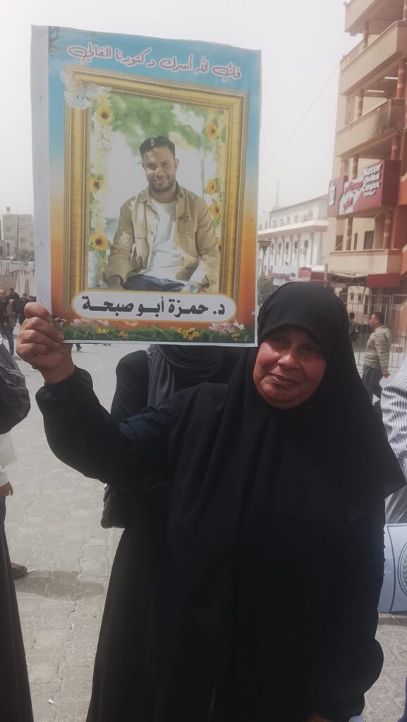 تقول أم الاسير “الدكتور حمزة ابو صبحة”، وعيناها تختزلان بالدموع : ” ابني لم يكن يحمل سلاحاً ، كان يحمل أدواته الطبية سماعته ، ورفض الخروج من عماله ،وهو الان مريض يحتاج الي علاج ، رغمام أنه هو الذي كان يداوي آلام الناس، ابني غاب بجسده، لكنه حاضر في كل تفاصيل حياتنا.