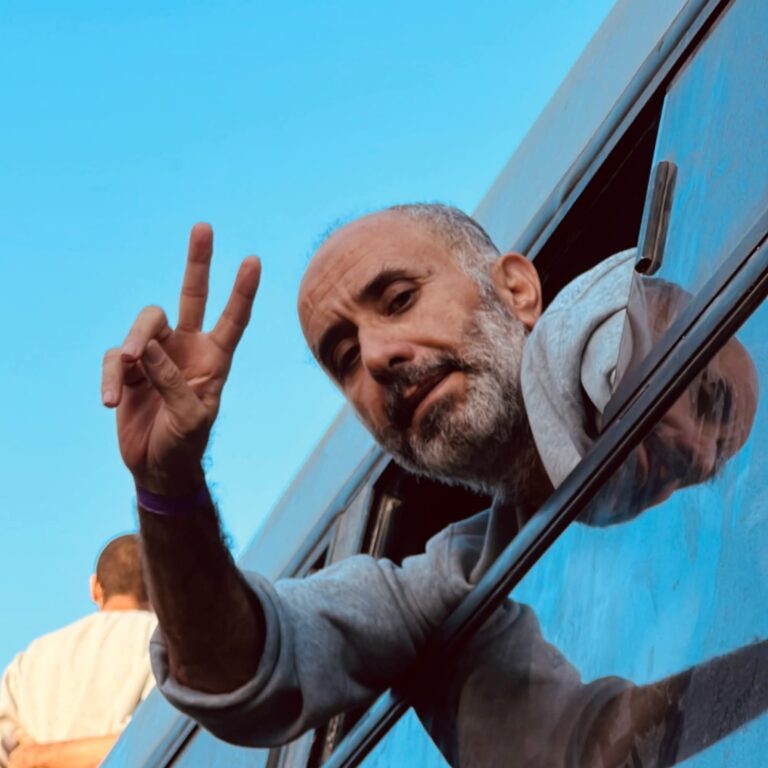 ، قائلاً بابتسامة رقيقة تخفي خلفها جبالًا من الألم: “أنا أبا عبيدة، أسير محرر مبعد من الضفة الغربية إلى قطاع غزة”.